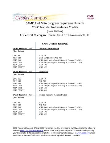 CENTRAL MICHIGAN UNIVERSITY MILITARY TRANSFER CREDIT Master of Science in Administration Program Credit based on American Council on Education recommendations and curriculum review (as noted) ... Access This Document
